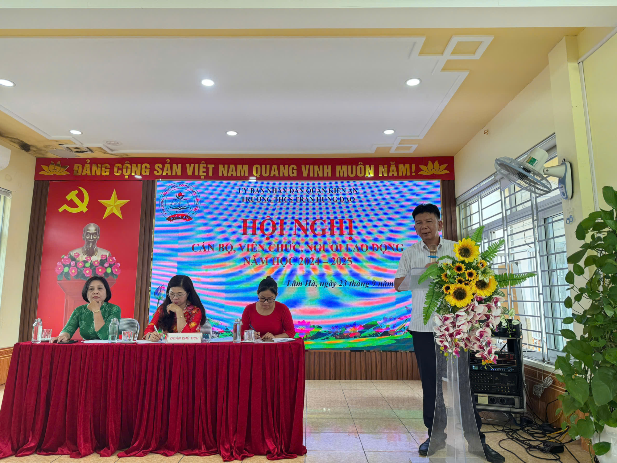 Sáng ngày 23/9/2024, trường THCS Trần Hưng Đạo đã long trọng tổ chức Hội nghị Cán bộ, Viên chức - Người lao động (CB, VC – NLĐ) năm học 2024–2025. Hội nghị nhằm đánh giá kết quả thực hiện nhiệm vụ năm học 2023-2024 và triển khai kế hoạch công tác cho năm học mới.