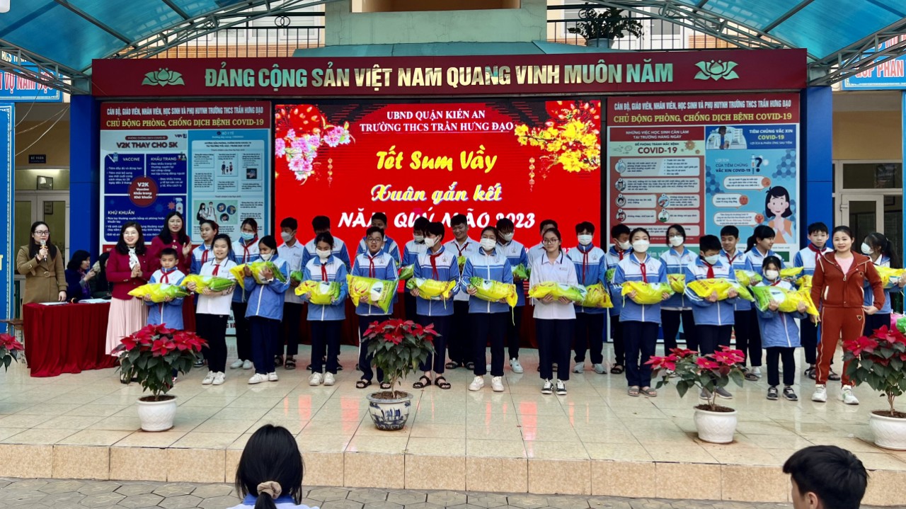 Hòa chung không khí vui tươi phấn khởi của cả nước chuẩn bị chào đón xuân Quý Mão 2023, sáng ngày 09/01/2023, Trường THCS Trần Hưng Đạo tổ chức Chương trình “Xuân gắn kết - Tết sum vầy” trao quà và tặng chăn ấm nhân dịp Tết đến Xuân về cho các em học sinh gặp hoàn cảnh khó khăn. Trường đã trao tặng 27 suất quà và 4 chiếc chăn ấm cho các em học sinh gặp hoàn cảnh khó khăn, cố gắng vươn lên trong học tập, rèn luyện. Với mong muốn, những món quà nhỏ sẽ làm ấm lòng các em học sinh đang gặp hoàn cảnh khó khăn, giúp các em có một cái Tết vui tươi, hạnh phúc.